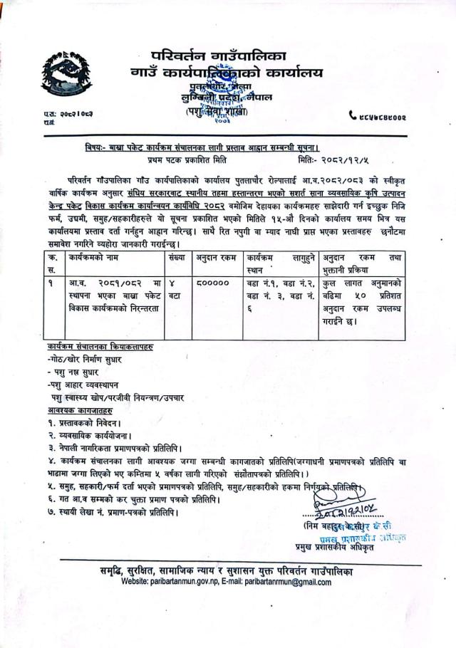 बाख्रा पकेट निरन्तरता कार्यक्रम सञ्चालनका लागि प्रस्ताव आह्वान सम्बन्धमा